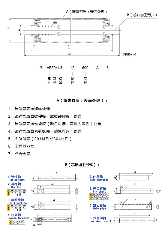 | 輥筒直徑D | 軸徑d | 壁厚t | 長度L | 筒體材料 | 表面處理 |